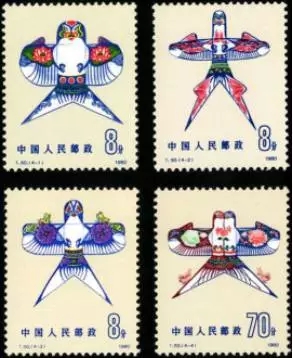 1980年5月10日,本套邮票共4枚。邮票选取了四种燕子造型的风筝,燕子以其远飞和高飞而著称。