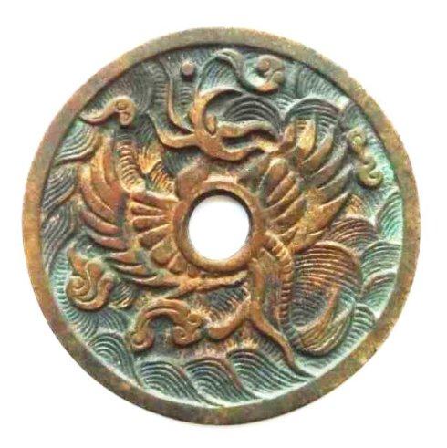 尚有多文字密码式钱文(有契丹文字的所有军事保密物品及祭祀物品:金银器、瓷器、玉器、书画、刺绣、铜镜、符牌、印章等皆是如此。),识读方法必须按古代密码破译法(全译重组法,藏头诗法,跳格法,错位法,替代法,嵌字法,反切法)去翻译解读。因此类契丹文破译涉及知识面太广,笔者以后会专文论述。这里就不再啰嗦了。辽契丹《契丹文应天大后为辽太祖送葬铸中心折读“天朝万岁”外环16字密码式钱文祭祀钱》(见图13、)就是“天朝万岁”祭祀钱的最好例证。(钱文解读请见笔者2016.8.12博文《面契丹文大字“天朝万岁”周十六个契丹小字背飞凤钱译释考述》)