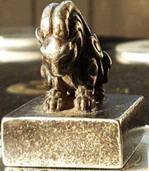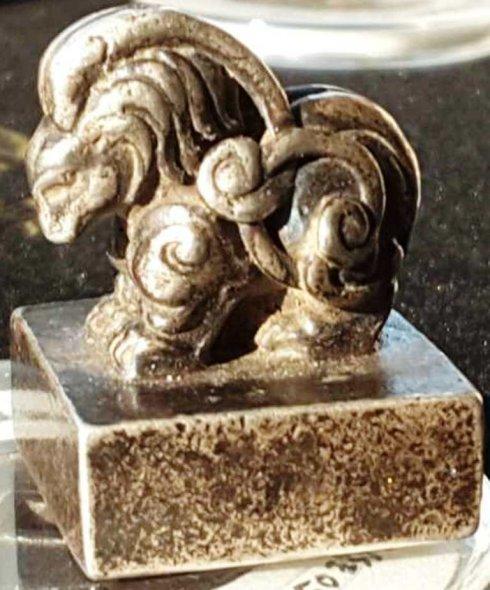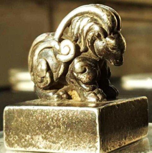 去年“天长地久”泉友给笔者发来一枚辽契丹国早期官印—“胡书”(原始契丹文)“天朝万岁”金印(见图1-5、),印高约8、90毫米左右,宽6、70毫米左右,印面65×65毫米,重约1020克上下,金质印材制作。印钮为上古神兽天禄:低头撅起长长双角,似要跃起冲向前方向敌人发起猛攻。天禄又名貔貅、辟邪,百解,是古代中国神话传说中的一种神兽,龙头、马身、麟脚,形状似狮子,毛色灰白,会飞。天禄凶猛威武,它在天上负责巡视工作,阻止妖魔鬼怪、瘟疫疾病扰乱天庭。天禄,顾名思义及吃天俸禄,行天之事。