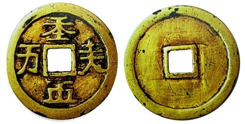 为了纪念“天朝”的建立,“天皇帝”耶律阿宝机和其后代不惜工本,铸制了许多记念性物品,如金银器、瓷器、铜镜、钱币、符牌、印章,用于庆典、赏赐、祭祀、使用。铸造最多的当属“胡书”纪念流通钱币“天朝万岁”钱。由于历代辽帝都有续铸,每次铸造用途不一。故造成“胡书”“天朝万岁”钱版别多异,读序歧出的现象。自“胡书”“天朝万岁”钱文上世纪七十年代被刘凤翥先生破译后。一些自诩精通契丹文的人士,对“胡书”“天朝万岁”四字的不同读序,又进行了新的译解。结果新是新了,却令后世收藏家、研究者对“胡书”“天朝万岁”四字,汉译到疷是不是“天朝万岁”四字?产生狐疑,无所适从,挑起争端。