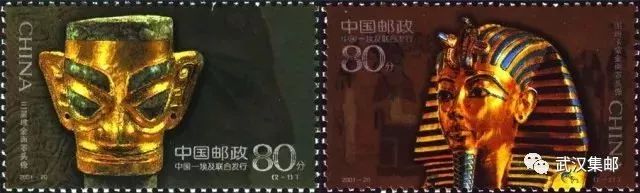 这是为纪念中埃建交45周年而发行的一套“纪票特发”邮票(与埃及联合发行)。2枚邮票分别由中、埃两国设计家设计,以三星堆金面罩和图坦卡蒙金面罩这2件工艺精湛、气度非凡的两国古代艺术品,展现了两个文明古国的悠久历史和灿烂文化。