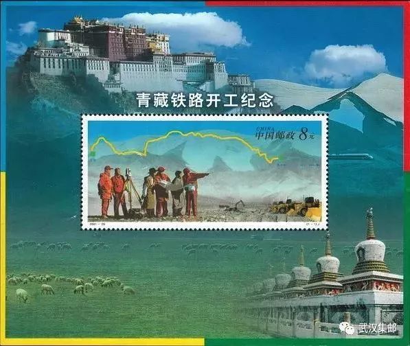 青藏铁路从西宁到拉萨,全长1956公里,是世界上海拔最高、线路最长的高原铁路。小型张以铁路勘探设计和施工现场照片为主图,以代表青海的塔尔寺如意宝塔、代表西藏的布达拉宫和高原羊群为边纸衬图,体现了我国实施西部大开发的雄心壮志和美好前景。