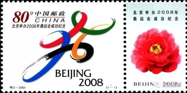 此枚邮票由大陆、香港、澳门三方同时发行,主图均为北京申奥标志(三方的附票和过桥分别为:牡丹、天坛祈年殿;紫荆花、香港中银大厦;荷花、大三巴牌坊)。该申奥标志以变形的奥运五环为基本元素,整体造型如一个打太极拳的人,邮票背景不设任何颜色,是申奥标志醒目而突出。
