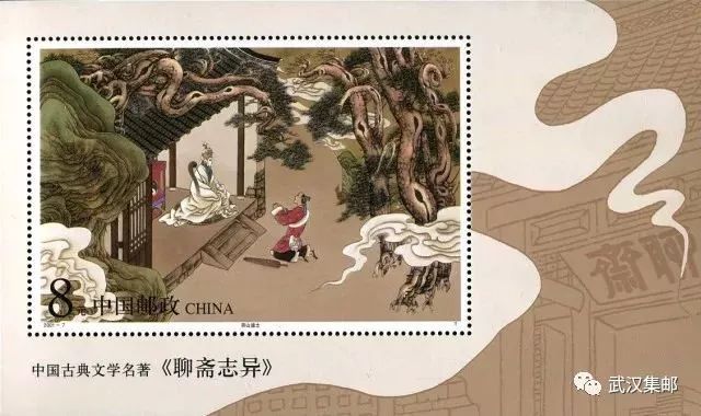 这套邮票是古典文学名著《聊斋志异》的第一组,分别表现了《婴宁》、《阿宝》、《画皮》、《偷桃》、《劳山道士》等5个故事。整套邮票采用传统工笔彩绘手法设计而成,构图饱满,人物造型和神态刻画精细。