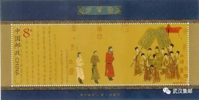 该小型张以卷轴形式设计,上、下设深蓝色衬边,邮票画面线条精细、人物传神,整体视觉效果古雅而凝重。将唐代著名画家阎立本笔法遒劲坚实、设色浓妍而不繁复的艺术风格,精确地展现在方寸之间。