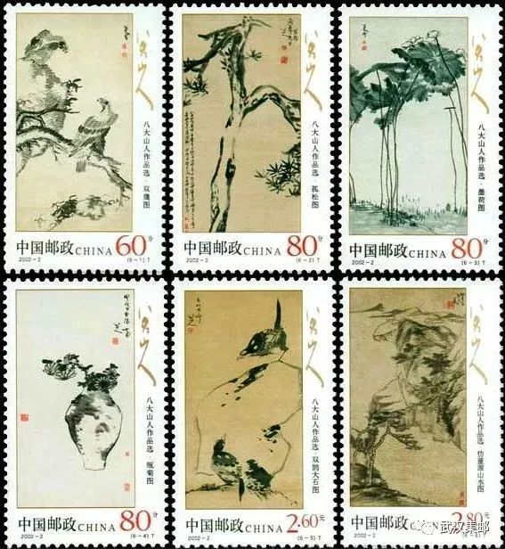 该套邮票选取明末清初杰出书画家、诗人八大山人(朱耷)的6件代表作,成功表现了他“缘物抒情,雄健简朴”的艺术气质,以及“眼高百代古无比,书法画法前人前”(石涛评语)的艺术境界。