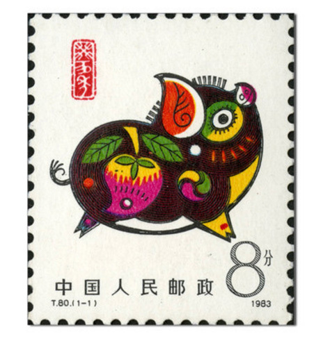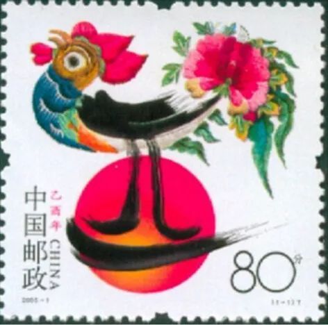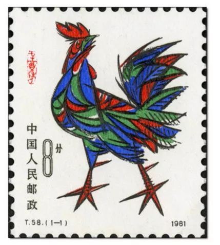 第一轮生肖邮票的第二枚是《辛酉年》鸡票,设计者是原中央工艺美院院长张仃先生。张仃是从延安走出来的艺术家。曾设计了《中国人民政治协商会议》会徽。1949年10月8日发行的新中国第一套纪念邮票《中国人民政治协商会议第一届全体会议》就是张仃和钟灵先生担纲设计的。说到《辛酉年》鸡票的图稿,还有一些细节。张仃先生画的鸡票第一稿,画面是公鸡和五毒。因为端午节“驱五毒”是民间传统,而公鸡是五毒的天敌。后来,张仃为了突出生肖“鸡年”这个主题,第二稿索性去掉了五毒,只保留了大公鸡画面。张仃非常喜欢毕加索的艺术风格,并曾几次邀请毕加索来华访问,但因种种原因,毕加索临终前也未能如愿。这幅“鸡”票图稿,各种色块的组合既体现出雄鸡羽毛的五彩斑斓,也把毕加索的艺术风格融合到自己的作品中。