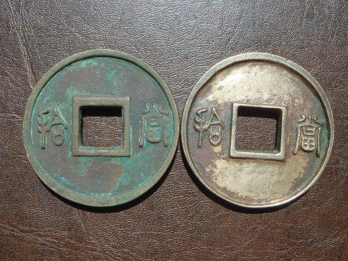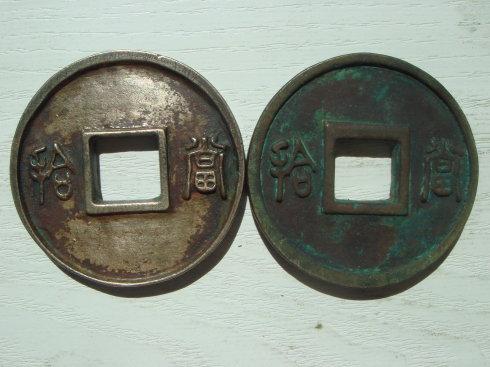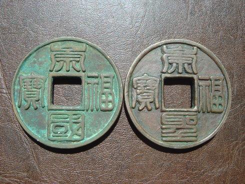 二、用相近的背景色重拍的图片。 1、这是未清洗的崇福國寶和清理过得崇福聖寶。大家一定注意,凡是含金质的钱币,只生薄锈,高含金钱币,必生红色浆锈。崇福聖寶的寶字的伤痕,那是历史的痕迹。