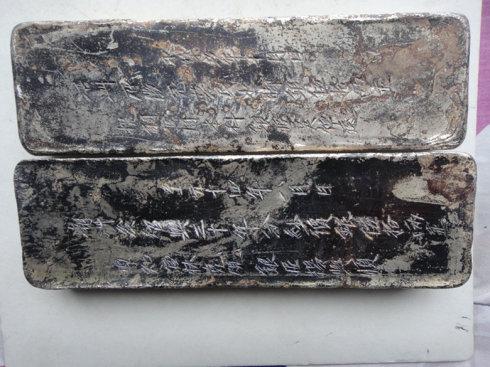 厚的一块上面的铭文是:至元十四年八月日 潮洲发绍興三十年分钞價银伍拾两正 专知官林克规银匠杨興顺 1775克