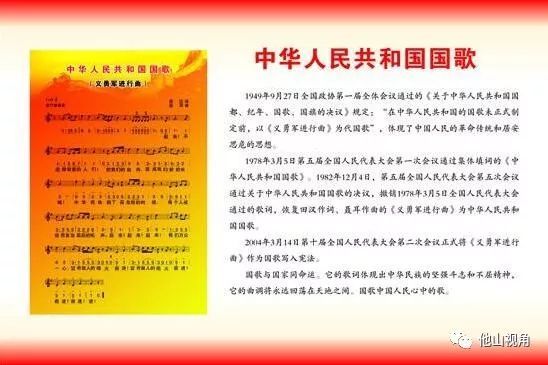1949年10月1日开国大典上,《义勇军进行曲》首次作为新中国国歌向全世界奏响。后来,《义勇军进行曲》被国家法律赋予《国歌》国歌的至尊地位。