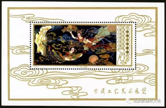 【邮票图名】大狮子(布玩具);三脚羊提壶(陶器);犀牛(漆器);小猫头(刺绣);绿花提篮(编织);孔雀壶(景泰蓝);荷花圆盘、黑天鹅盒(漆器);飞跃(木雕);旭日东升(牙雕);奔向人间(牙雕);小型张—飞天(壁画)
