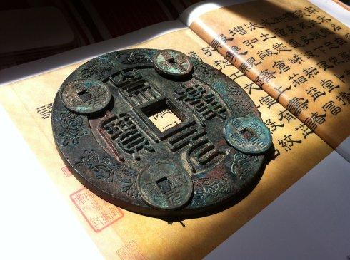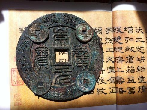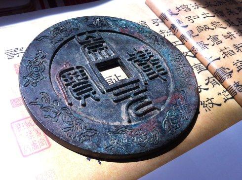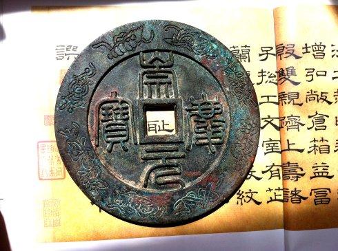 崇庆元宝阴刻纹饰大钱 日期:2018-01-29 作者:涅祁之重圜 此钱外缘装饰暗八仙、八宝图案,背面地章是四只蝴蝶纹饰,穿口范线明显,是范铸工艺制成。 请泉友老师,品评、鉴赏! 直径:140mm;厚:7mm。