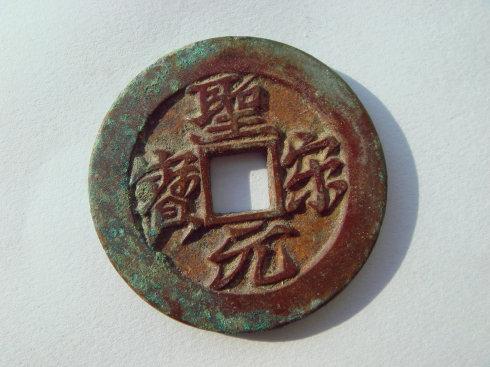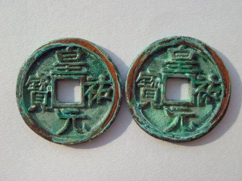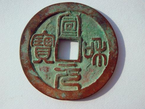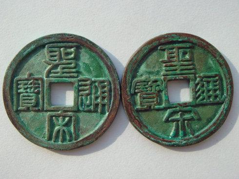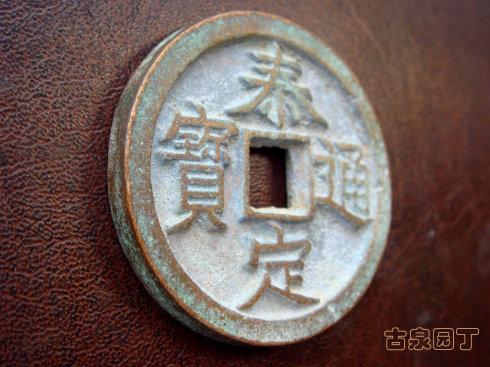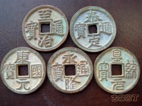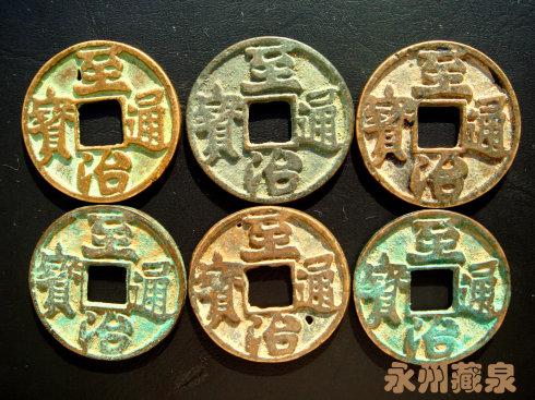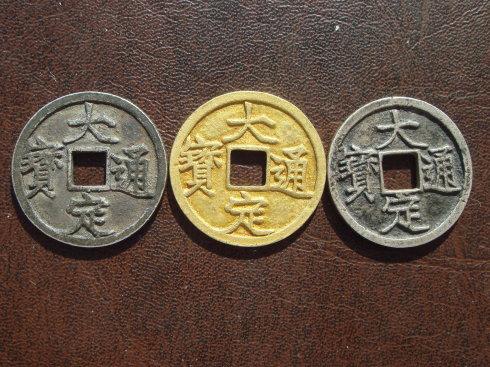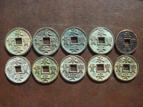 2、而铜钱因为合金成分不一样,埋藏在不同的地域,锈色绝对各有不同。精炼的铜,生锈就少。右上角是承安宝货背三两。黑色,材质极好。