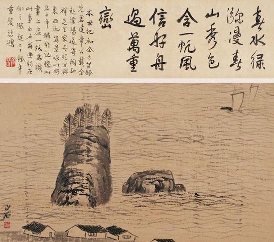 山水 齐白石 50×94cm 纸本墨笔 1935年 徐悲鸿纪念馆藏“倾胆徐君”源自齐白石的自作题画诗“我法何辞万口骂,江南倾胆独徐君。”在这幅赠予徐悲鸿的山水画中,齐白石深为自己有徐悲鸿这样的艺术知己而欣慰,更为徐悲鸿力排众议推崇自己山水画风的胆魄而感动。齐白石的山水画源自他早年“五出五归”的远游经历,真山实水的真切感受使得齐白石的山水画构图奇崛、简洁大胆,用色明亮、轻松欢快,一反清末民初画坛尊崇的“四王”山水风格,但是在北平的传统画界认可齐白石山水风格的人却是寥寥无几,甚至还有很多画家对他的山水创新提出质疑。而推崇改良中国画的徐悲鸿却敏锐的发现齐白石山水画的艺术价值,以及赞扬其“胆敢独造”的艺术创新精神,“倾胆徐君”也就成为齐白石对这位忘年艺术知己的最好评价。