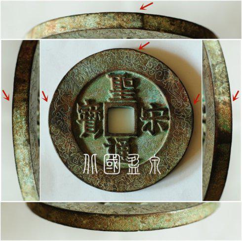 图3、直径95.8毫米的“圣宋通宝”阴刻花纹大钱,上、右、左三侧都保留有未去除的隆起台基。