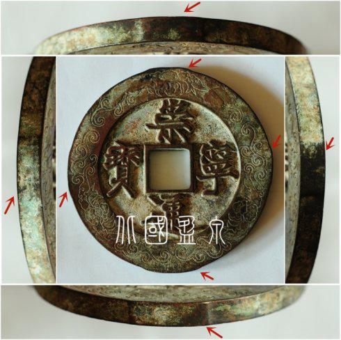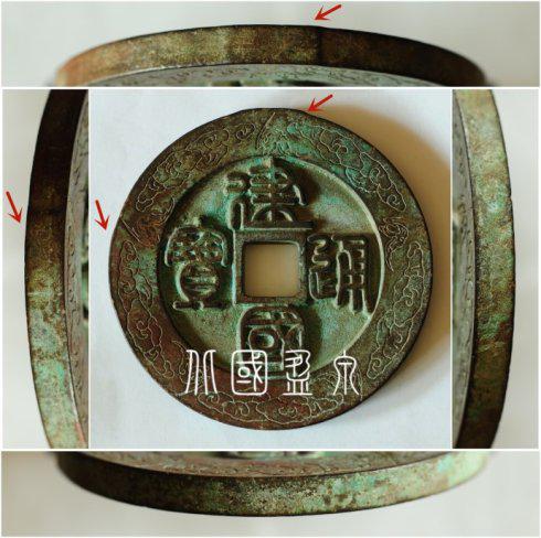 古钱币无论用什么方法铸造,都会留下铸造痕迹。这种痕迹就是铸造过程中在钱币上形成的位置移动、材料增减、形态结构改变等物质性变化所留下的印记。金属的铸造痕迹是痕迹学在考古领域的重要研究对象。它是对时间的反向指证。通过钱币上与时间相关的信息,就可以还原与之相对应的制造过程和制造方法。那么,我们在阴刻花纹大钱上是否也可以找到与铸造有关的痕迹呢?回答是肯定的。在笔者集藏的许多大钱的钱文方向外部边缘上都发现有隆起的台基。这些台基无疑会影响到外圆的规整,所以它们应该是制造过程中需要努力去除的对象。可是由于古代加工能力的局限,或者也有工匠不负责任的因素,在个别钱币上这种痕迹还是被保留了下来。在笔者集藏的钱币中,直径72毫米左右的钱币上这种痕迹不十分显眼,而直径96毫米左右的大钱上这种痕迹更为突出。这是因为后者的厚度超过前者将近一倍 ,后期加工难度更大所致。下面图1至图5中所列钱币直径都在96毫米左右,图6中所列钱币直径都在72毫米左右。红色箭头所指即为钱币外缘上隆起的台基。由于锈迹覆盖,从照片看有的隆起并不明显,实物上都是显而易见的。
