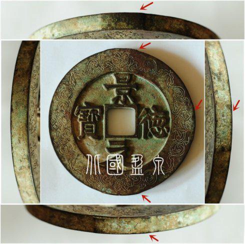 图2、直径95.6毫米的“景德元宝”阴刻花纹大钱,上、右、下三侧都保留有未去除的隆起台基。