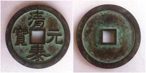历代所铸祭祀大钱与行用钱是一一对应的,是否铸有行用钱,祭祀大钱是最好的明证。下面就介绍一种涅祁之重圜泉友集藏的“清泰元宝”祭祀大钱。是钱直径71.7毫米,中缘细郭,穿孔较小。面文“清泰元宝”对读,书法介于楷隶之间,“清”、“泰”、“元”三字已趋向楷书,而“寳”字仍为隶书。钱文笔法与目前所见各种“清泰元宝”行用钱都是同一风格,与折十型大钱写法尤为接近。可以断定两钱钱文皆为一手所书,但也有细节差异,不是一次书就。钱币光背无文,面背均未加铸阴刻纹饰。从钱币的精整程度和表面锈蚀情况看,这枚钱币亦为用失蜡法铸制的鍮石大钱无疑。其直径亦符合72毫米左右祭祀大钱的等级标准,是一枚素面无阴刻花纹的祭祀大钱。