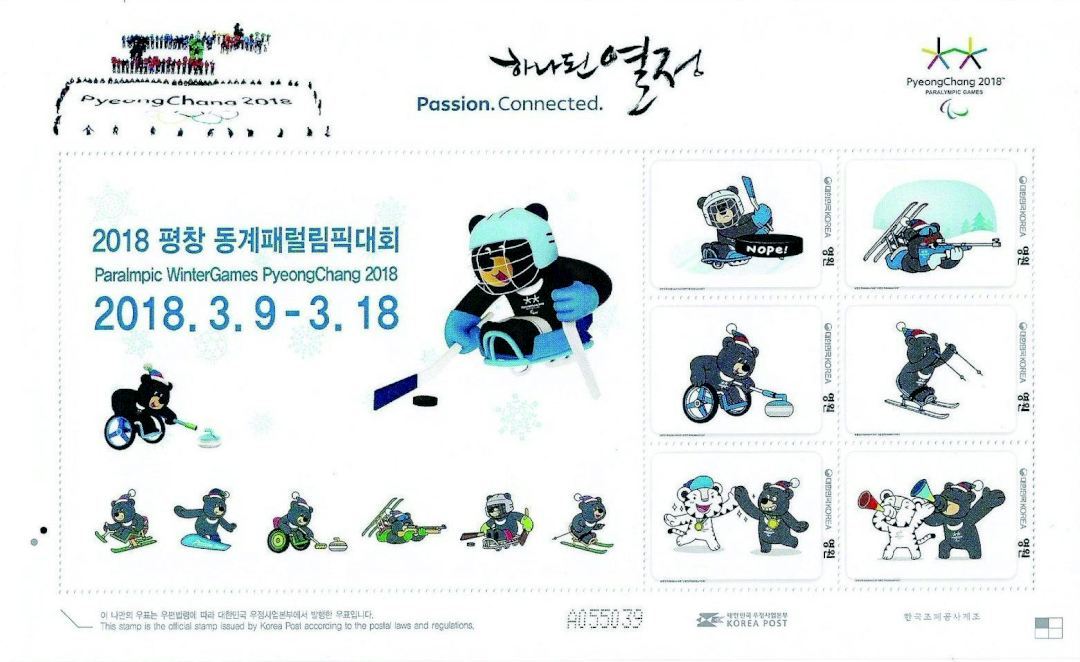 2018年1月18日,韩国发行2018残奥会小版,共计10枚邮票,画面展示残奥会会徽、火炬、吉祥物,还有各项冬季残奥会运动项目,发行量80万套。而在开幕当天的2月9日,则会发行开幕式邮票小版,邮票画面展示了接力火炬和冬奥奖牌,发行量129万套。