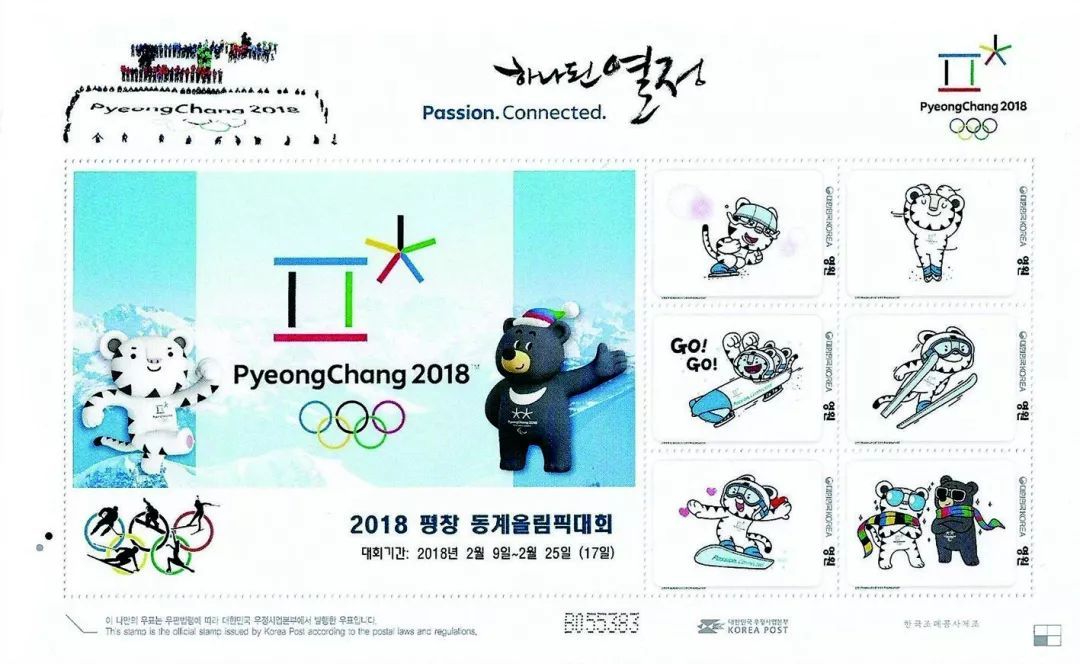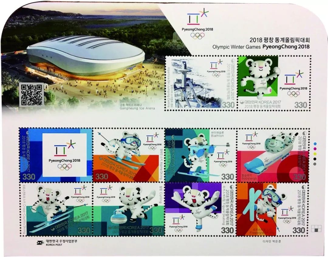 简单介绍了平昌冬奥会的关键元素后,我们再来看看邮票发行情况。在2017年11月1日,距离冬奥会开幕100天,韩国邮政发行了一套20枚邮票超大系列纪念邮票,用两个小版张布局,冬奥会15大比赛项目,依次展现。每版10枚邮票,每枚面值均为330韩元,约合人民币两元。11月1日起,在全国220多家邮局和邮局官网上销售,发行量140万。图案左上角是江陵冰上场馆,扫描二维码还可以获得观看赛事指导和交通线路等,非常贴心。10枚邮票分别介绍了开闭幕式的平昌冬奥会体育场和吉祥物,以及各项冬奥会项目,作为猫科的小白虎参加各种冰雪项目身姿矫健,而又充满力量。展现的比赛项目依次是冰球、无舵雪橇、北欧两项、短道速滑、俯式冰橇、跳台滑雪、单板滑雪、速度滑冰。