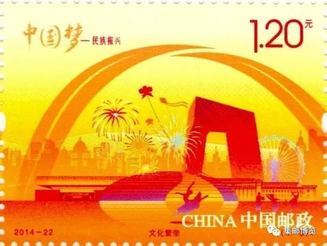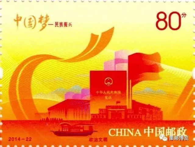 该套邮票图名分别为:政治文明、经济发展、文化繁荣、民族团结。邮票艺术地反映了“中国梦—民族振兴”的主题,以腾飞的金丝带贯穿画面,寓意中华民族的振兴。