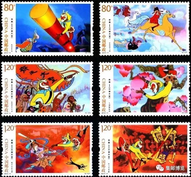 《大闹天宫》是上海美术电影制片厂于1961年-1964年制作的一部彩色动画长片。该片作为中国动画片的经典,影响了几代人,是中国动画史上的丰碑。本邮票分别展现了龙宫夺宝、官封弼马温、智封齐天大圣、大闹蟠桃园、勇斗天兵天将、打上灵霄店。
