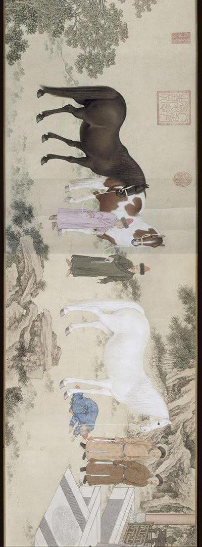 大宛天马并不知道,自己在郎世宁笔下扮演了什么样的角色。它们更不知道的是,郎世宁的画笔在勾勒它们矫健形象的时候,并未忠实于自己所见。事实上,阿布赉汗进贡的马是两匹而非三匹,一白一花一枣红三匹,哪一匹是郎世宁P到图上去的,只有意大利传教士自己知道。