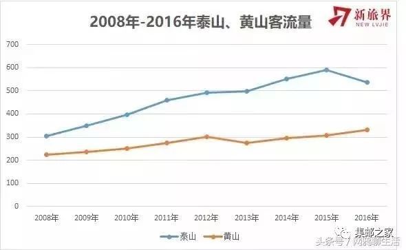 自2008年-2016年,泰山和黄山年游客接待量皆成稳中上扬趋势,但相比黄山,泰山景区客流量增长幅度更为明显。