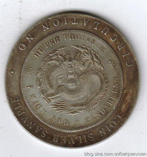 黑龙江省造光绪元宝库平七钱二分禁止流通银样币,背面湖北龙。应为1896——1898年中间,由湖北银元局代铸银元样币。