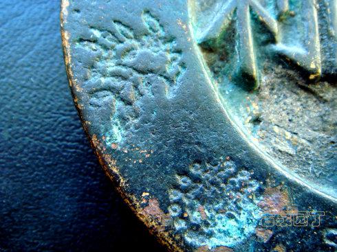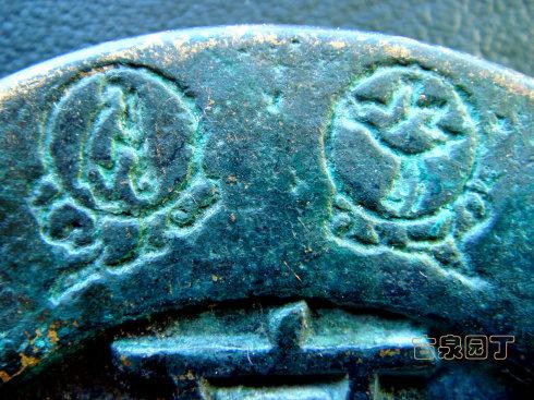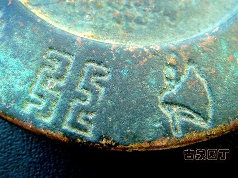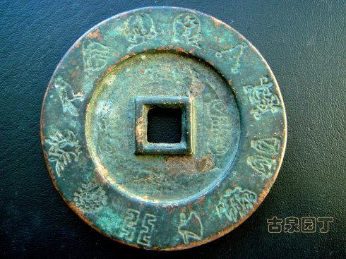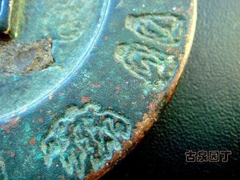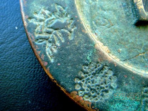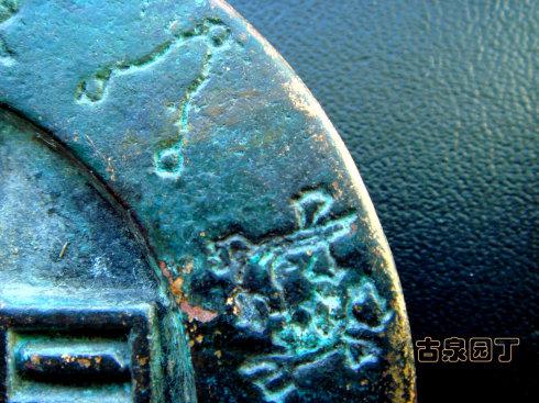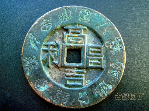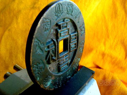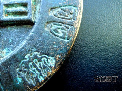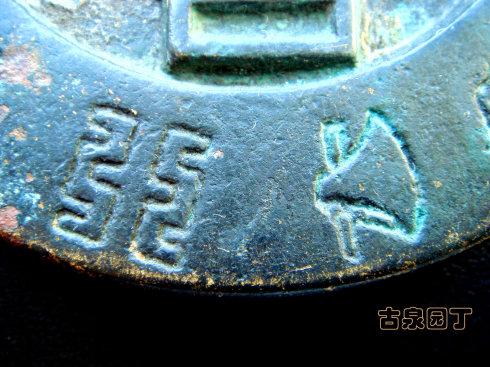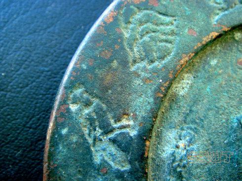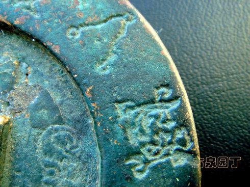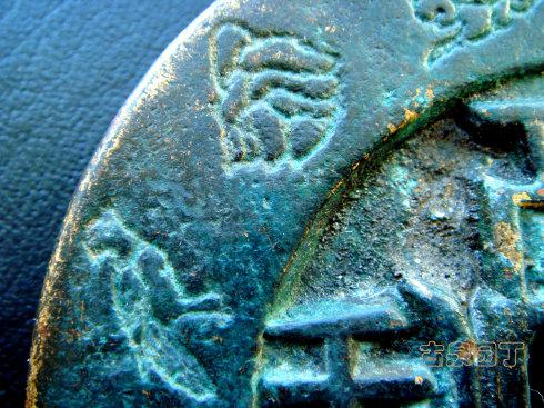 在网上查到一枚同品镇库钱。除了锈相和磨损。几乎相同。阴刻花文很清晰。