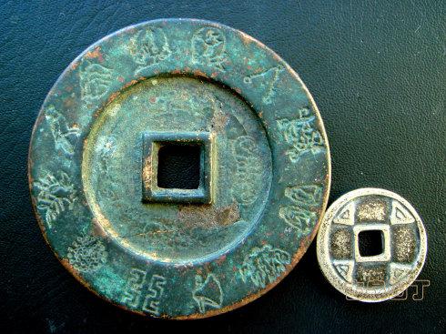 高昌吉利古钱币是最有故事的钱币。我这枚镇库花钱直径70毫米,厚度5.0--5.6毫米。旁边的高昌吉利银钱,直径27毫米,厚2.3毫米。