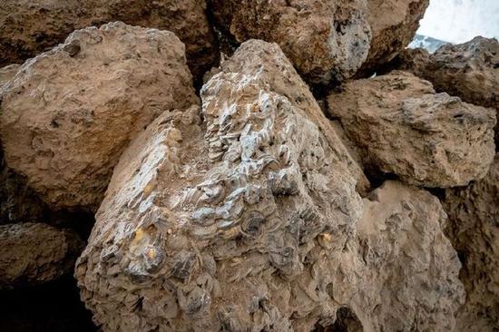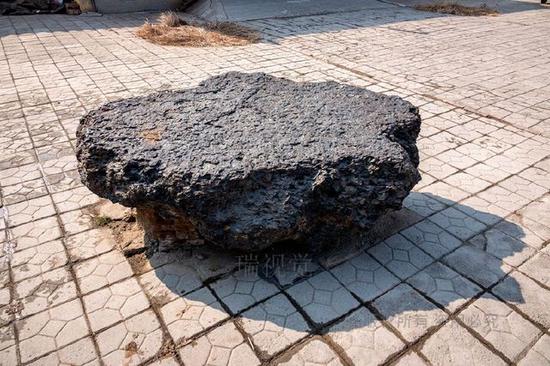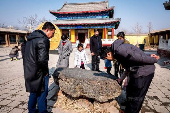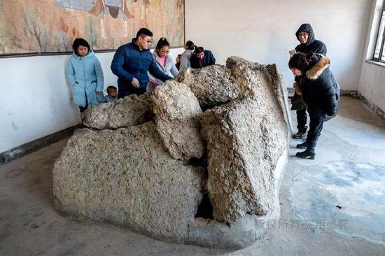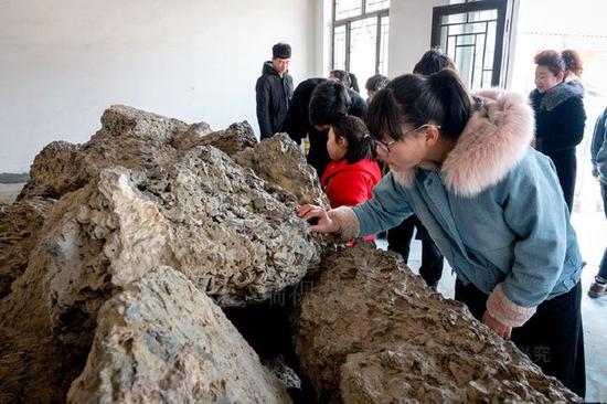 游客在古币展馆前面观看一疙瘩硕大的铁钱。这疙瘩铁钱有七吨重,因太重、太大而无法拖入馆内,只能寄放于院内场地上。据介绍,沧县旧州镇的铁钱最早出土于1997年,已经出土的铁钱币约50吨。据文物专家勘探,目前埋藏于地下的铁钱币超过50吨。