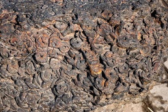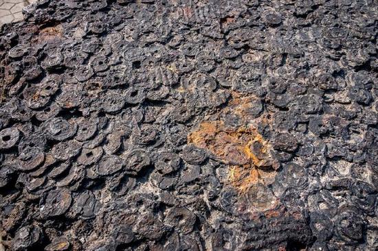 重达7吨的铁钱疙瘩。铁钱,俗称大铁钱,比一般的铜钱大,始于汉初的铁“半两”,至宋尤其徽宗时达到使用的一个高峰期。据专家说,唐宋时期的主要货币是圆形方孔的铜钱,而在北宋徽宗时期,由于和北方辽金长期打仗,导致国力衰微,铜钱铸不起了,只好铸铁钱充数。重达7吨的铁钱疙瘩。