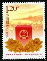 2013年3月5日至15日,第十二届全国人民代表大会第一次会议在北京召开。此次大会纪念邮票为一套1枚。背景图案为人民大会堂的万人大礼堂,正面为一个挂有中华人民共和国国徽的投票箱。