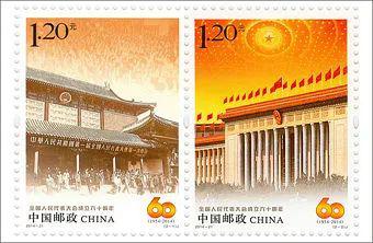 2004年9月15日,《人民代表大会成立五十周年》纪念邮票发行,一套2枚。图面分别为“一届全国人大一次会议在中南海怀仁堂举行”和“庄严的人民大会堂主席台”,全套邮票面值为1.60元。