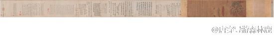 揉揉眼看清楚了,右边的画只占了长卷很小篇幅,左边那一篇篇书法,都是历代收藏者写的题跋之类,另纸写完粘上去的。全卷共有22跋,时代由宋至明,其实卷本比上面的图片还要长得多。离画面最近、底本颜色也一致的,是这作品最早的题跋,按字面讲,是晚唐名相李德裕撰文。