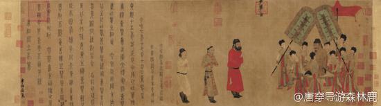 再说句良心话,“步辇图”=“逼婚图”的事估计并不是导游鹿的独创发现,很多老先生都心里清楚(那篆书题记写得太明白了),然而为了大家众所周知的原因,在写说明介绍时做了模糊处理。比如开头我引的那注释,“该图取材于唐贞观十五年(641年)吐蕃首领松赞干布与文成公主联姻的事件”——没说错吧,禄东赞被逼婚,本来也是唐蕃和亲大事中的一小部分——“描绘了唐太宗李世民接见吐蕃迎亲使者的情景”——两个人验明正身无误,“接见”也无误,总之我们是不造假的你理解偏了是你自己的责任……