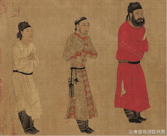 而步辇图里,站前面的红袍大臣和后面的白袍男,都是一身T恤牛仔的常服打扮,什么风气,什么态度!