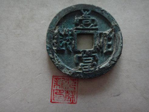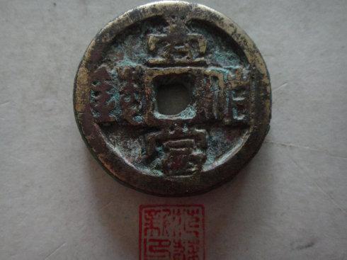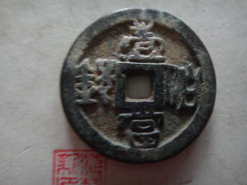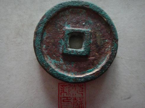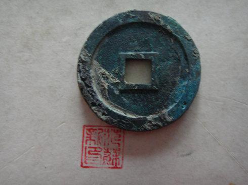 这二枚厚分别为3MM和2.5MM,我分析兰绿锈钱是样钱,未流通。黑锈钱钱,红铜质,直径最小,厚度最薄。二枚的重量在27克和22克。