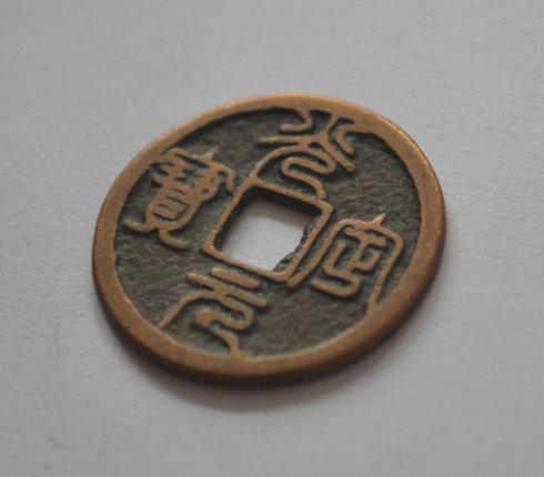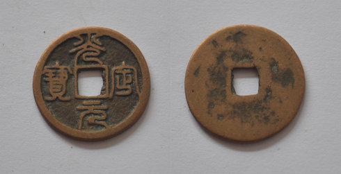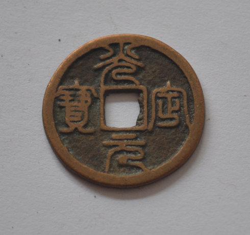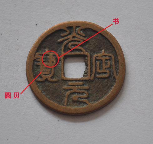 从历代方孔钱上看,一般“宝”字上都是“王尔”、“王王”、“缶尔”的三种组合形式,但这枚光定元宝却是“王书”的组合,这种组合形成的“宝”是非常罕见的。在我收藏的各朝代钱币中,“王尔”很常见,几乎没见到过第二枚“王书”钱。为什么这枚钱是“王书”呢?毋庸置疑,这是个一个王(皇帝)书写的钱文。