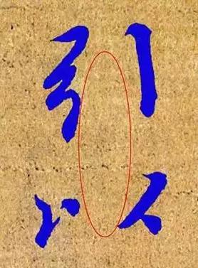 “引”字一般我们不会写得这么开,而且“弓”字还微微向左倾斜,“竖”向右倾斜;下面的“以”字左右离得也很远,要是给外国人看,一定以为是俩字。但是当两个字连在一起的时候,奇迹出现了。“以”的左边和上边的“弓”是对牢的,右边和竖是对牢的,中间的空白就连在了一起。古人认为这空白中似乎有滔滔江水流过。