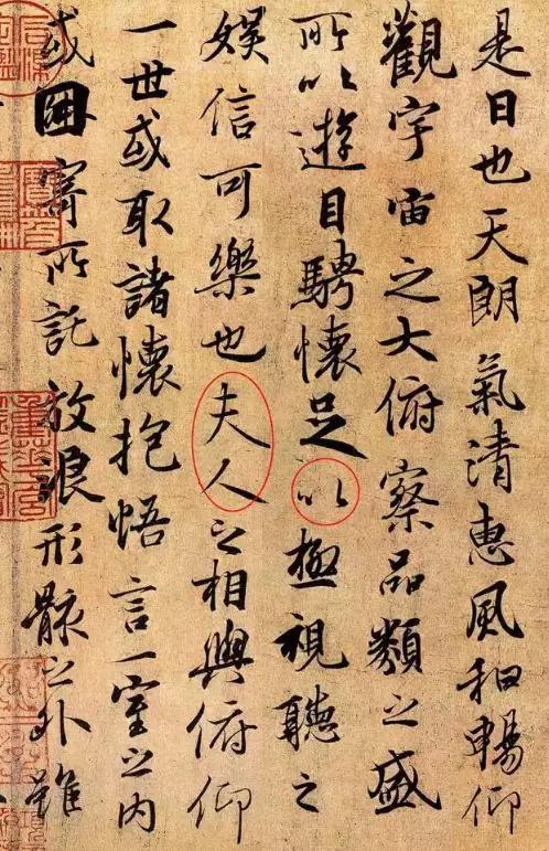 但是到了第二行,“夫人”两字相比上下突然变得细了,而且捺笔都伸了“以”字,这样右边的“以”字就不会显得孤单了,三字跨行融合到了一起,由此可见王羲之随机应变的能力之强。