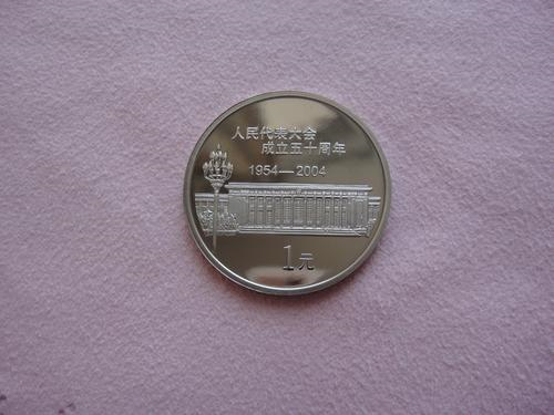 人民代表大会成立五十周年普通纪念币。2004年,中国人民银行发行人民代表大会成立五十周年普通纪念币,上海造币厂铸造,材料钢芯镀镍,面值一元,直径25毫米,发行量1000万枚。其中精制币发行了2万枚,主要用于造币行业技术交流与人民群众钱币收藏。该纪念币正面主景图案为国徽,内缘上方刊“中华人民共和国”国名,下方刊“2004”年号,背面主景图案为人民大会堂,内缘上方刊“人民代表大会成立五十周年1954-2004”字样,内缘下方刊“1元”字样。