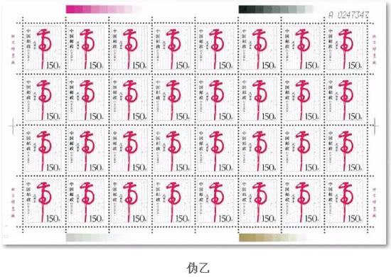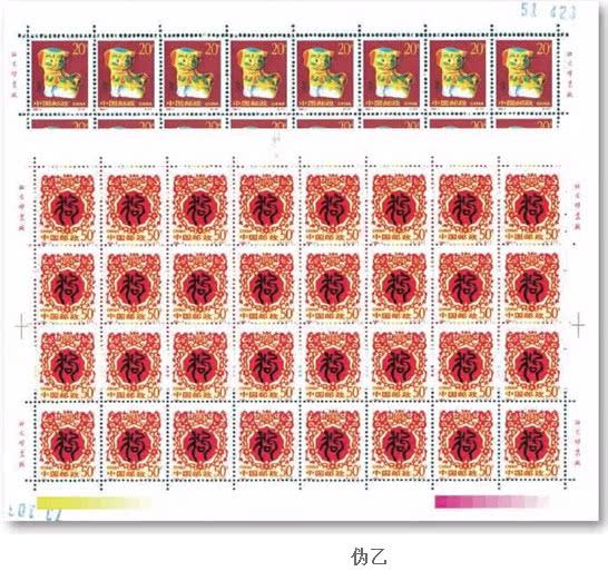 真品采用前期邮票纸印制,在紫光灯照射下,白纸面无荧光反应;伪甲和伪乙则采用防伪纸印制,在紫光灯照射下,白纸面呈暗紫色,并呈现四色荧光彩点。
