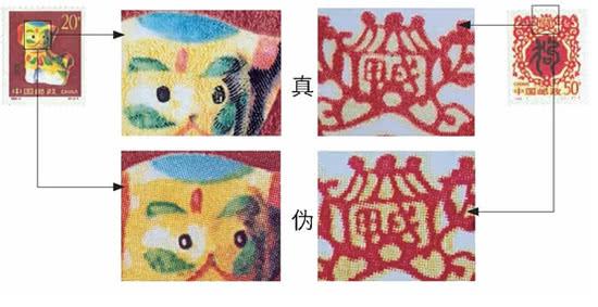 真品《甲戌年》邮票采用影雕套印。影写版印制的图文,各种刷色的网纹夹角均呈45°,圆点大小相同,呈中空状,文字笔画边缘呈锯齿状,雕刻版印制的图案,线条清晰,凸出纸面;伪品采用胶印,各种刷色网纹夹角各不相同,网点呈实心状,经测定,伪甲和伪乙均采用胶版175-200线/英寸套色印制,各种刷色网纹夹角伪红色呈15°,蓝色呈75°,黑色45°,黄色呈0°,而伪乙红色呈75°,蓝色呈15°,黑色呈45°, 黄色呈0°。两种伪品(2-2)中的图案中心篆书“狗”字,均采用黑色网纹版专版套印,这与真品采用雕刻版印制,区别极明显。