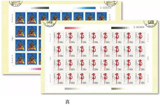 对于《丙戌年》邮局全张邮票的鉴定,在进行上述版别鉴定的基础上,还应该注意邮局全张边纸上的黑色数字喷码特征,真品和伪品所用黑色数字喷码字体有别。在鉴定中还发现,真品与伪品黑色数字喷码喷印在版票纸面上的位置也不一样,真品喷印在版票下边纸右下角,伪品则喷印在版票的右边纸右下角上。