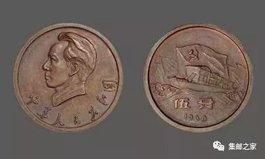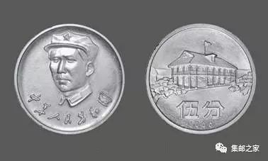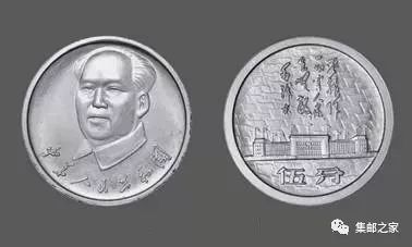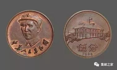 正面为毛泽东老年像,背面为人民大会堂,上方刻毛主席语录“要扫除一切害人虫,全无敌”。无年号,面值伍分。