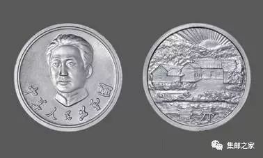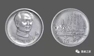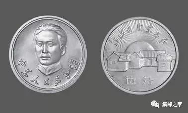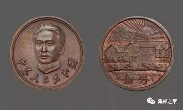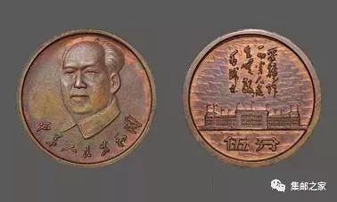 正面图案为毛泽东青年像,背面为韶山,上方刻“韶山日出东方红”,无年号,面值伍分。