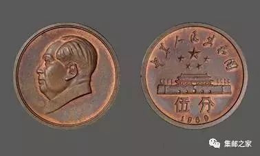 正面为毛泽东老年侧面像,背面为天安门、国号,年号1969,面值伍分。
