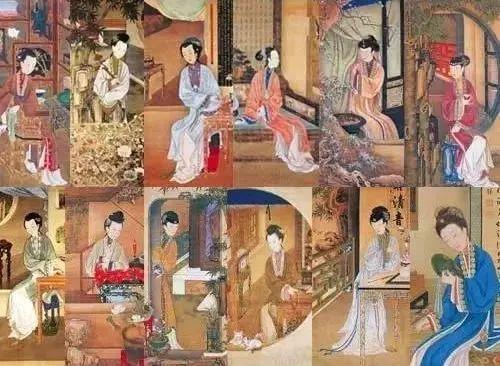 北京故宫博物院现存一套清宫旧藏美人图,共12幅,是由清初宫廷画家创作的工笔重彩人物画。每幅尺寸相同,均纵184厘米,横98厘米,绘在品质精美的绢底上。以单幅绘单人的形式,分别描绘12位身着汉服的宫苑女子品茶、观书、沉吟、赏蝶等清娱情景。